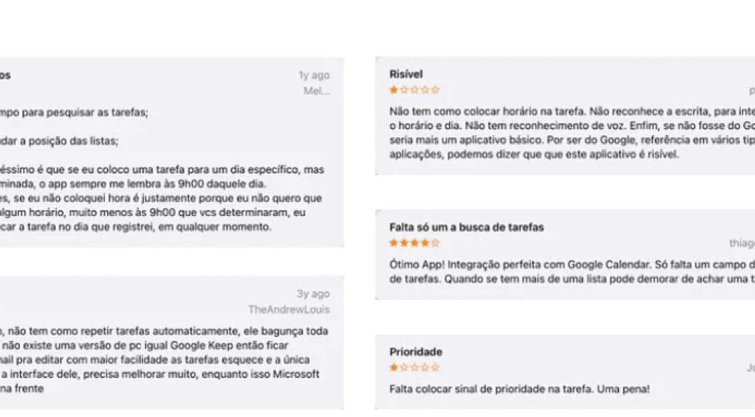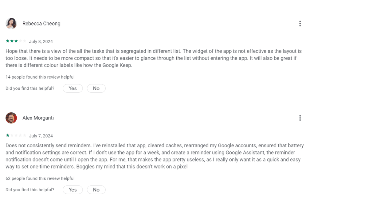 To understand more what the app is lacking, I also read and analyzed Google Tasks ratings and reviews on Googleโs Play Store and Appleโs App Store.