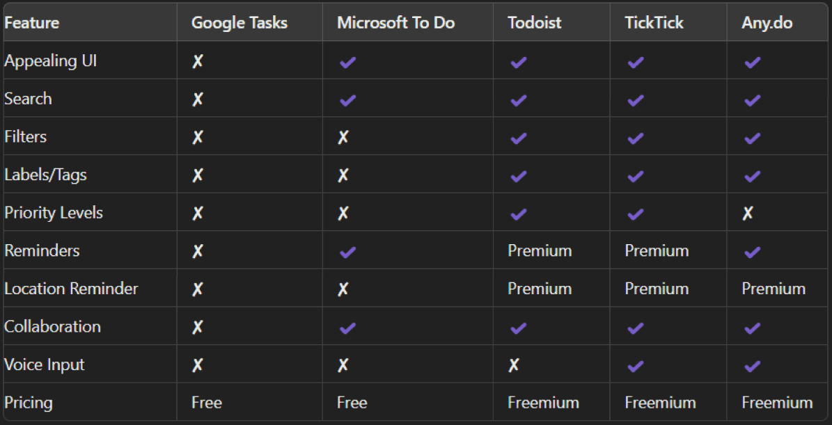 By analyzing the competition, I identified several areas where Google Tasks could be improved. The app lacks essential features such as advanced search, filters, labels, and collaboration options that are commonly found in other popular task management apps.