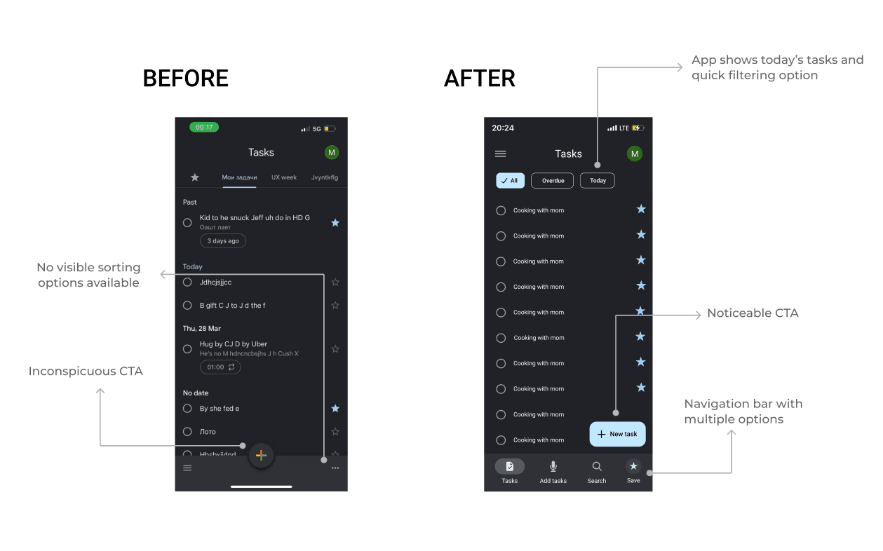 My first objective was to enhance the user experience when launching the app. The initial screenshot (before) reveals a lack of options for users to quickly get an overview of their to-do list. The updated design (after) introduces an improved user interface, featuring more prominent call-to-action buttons, and added sorting and filtering functionalities.
