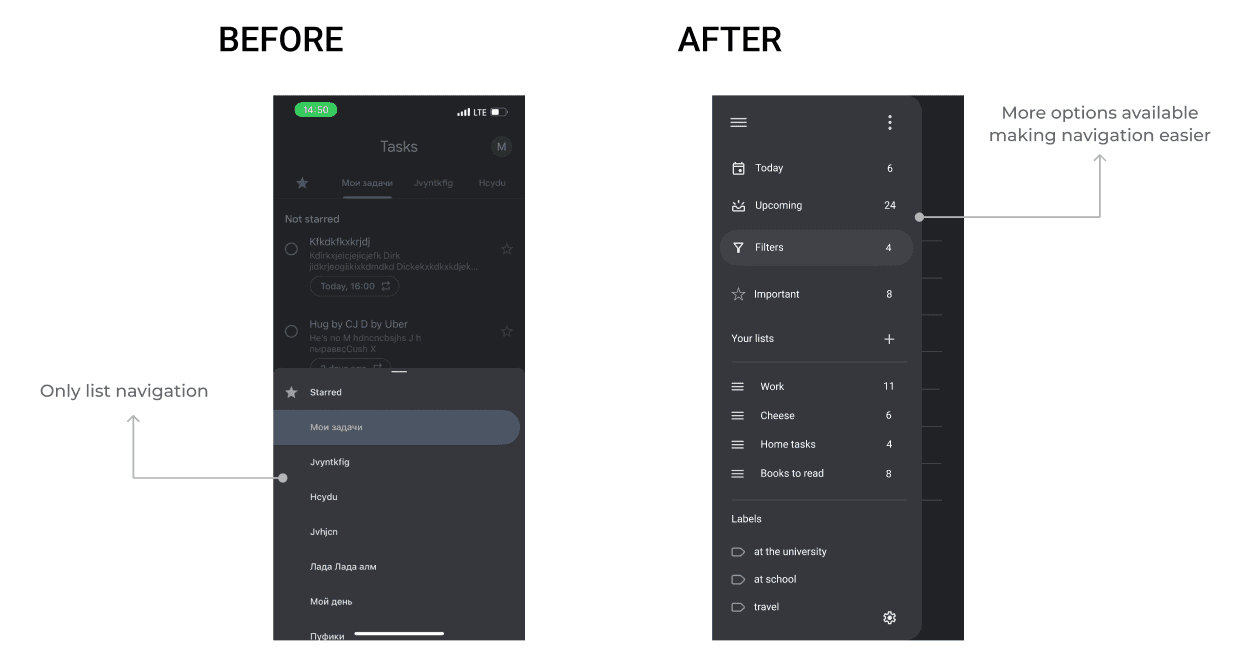 Offering only a basic list navigation feature, which made it difficult for users to manage their tasks efficiently. The "after" screenshot showcases a redesigned navigation drawer that includes quick actions for users to manage their lists easily.
